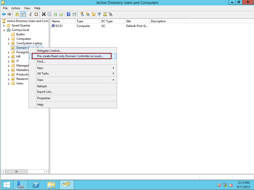 2 - Next, in Active Directory Users and Computers, right-click Domain Controllers, and then click Pre-create Read-only Domain Controller account...