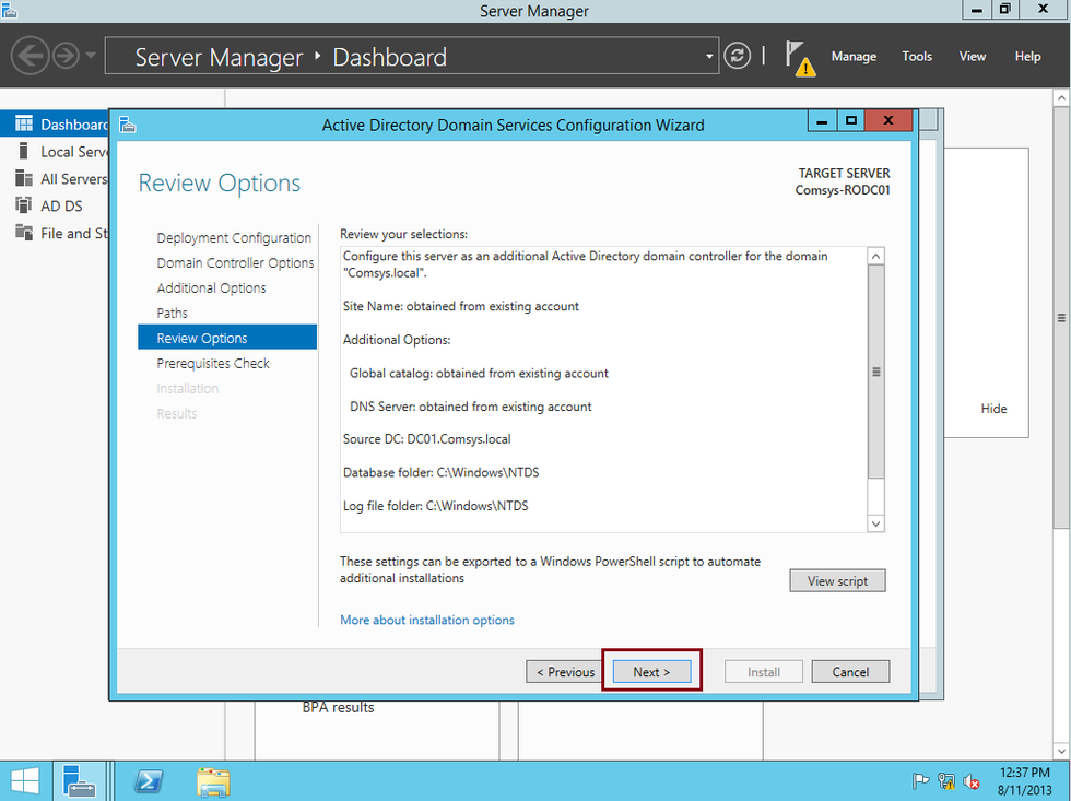 25 - On the Additional Options box, beside Replicate from, click the drop-down box, click DC01.Comsys.local, and then click Next...