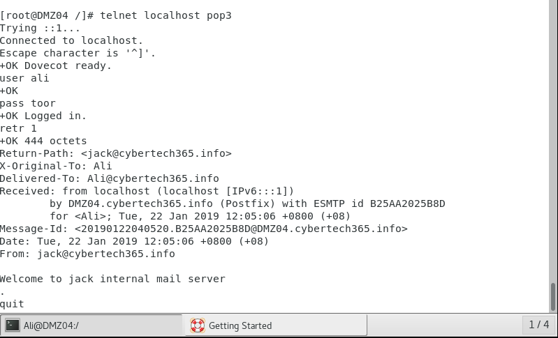 Test pop3 connection with telnet, retr 1 is use to retrieve the whole message in mail directory