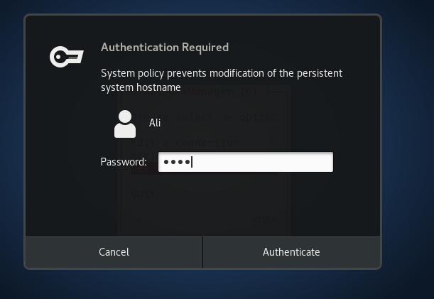 Key in password for Ali(the user that we set up during installation of centos7) to change the hostname
