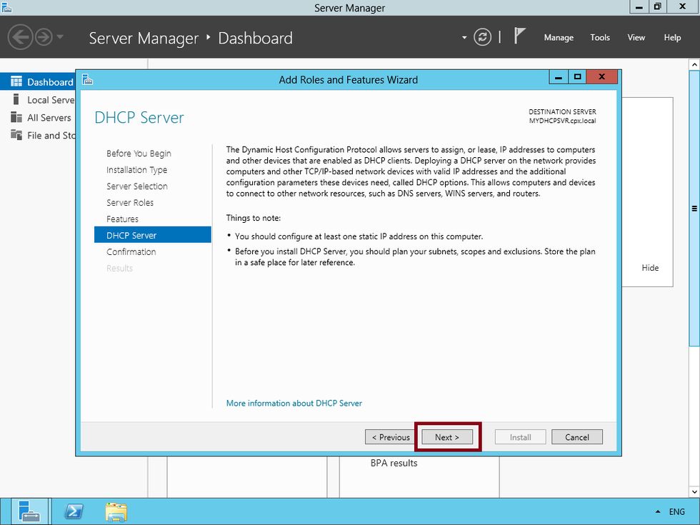 I will install DHCP Services in Member Server machine which is mydhcpsvr.cpx.local.